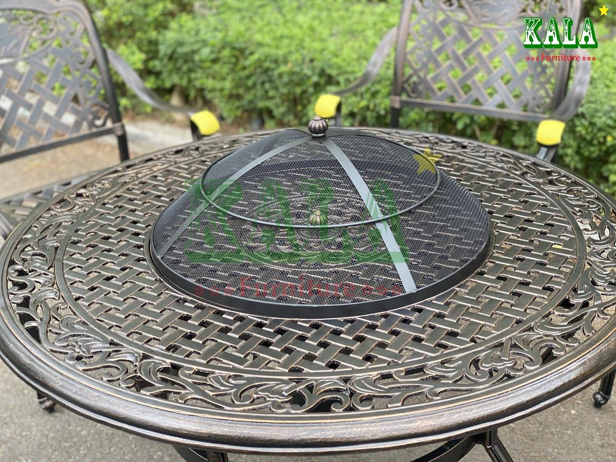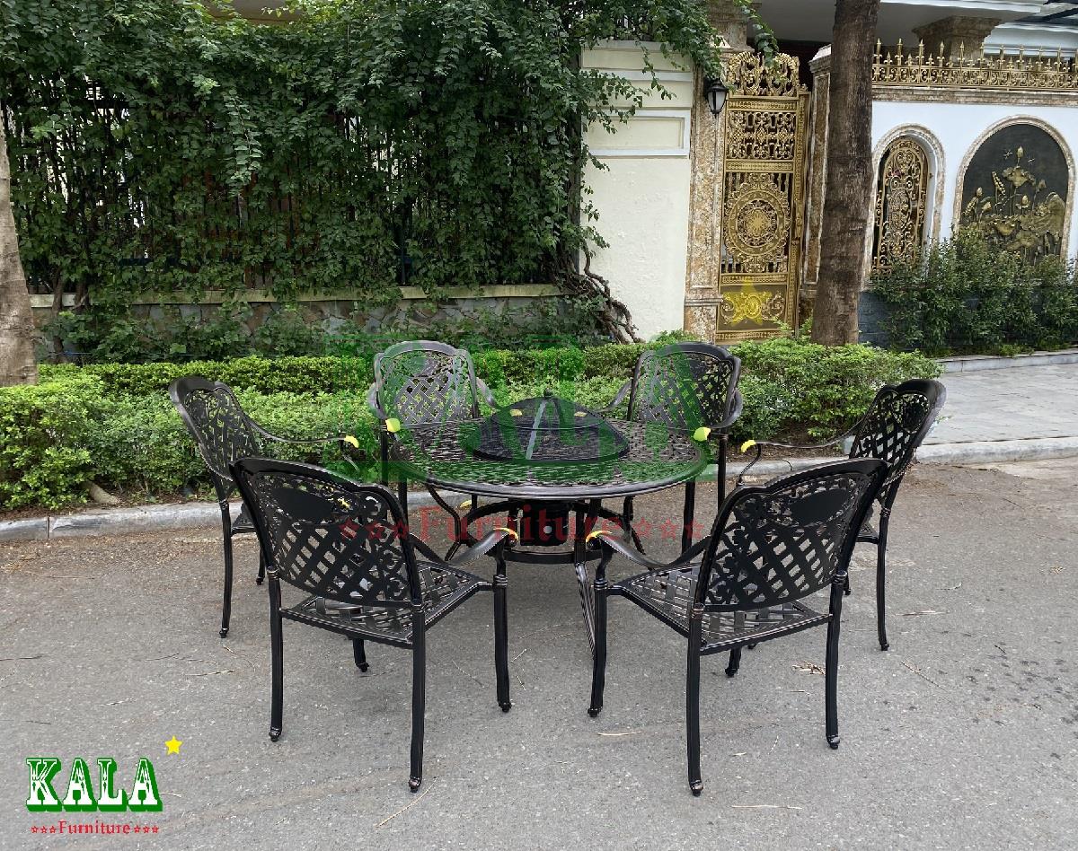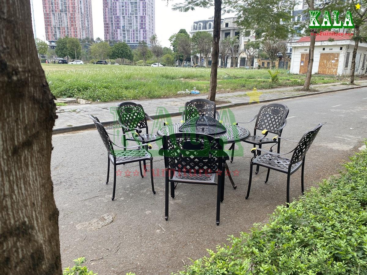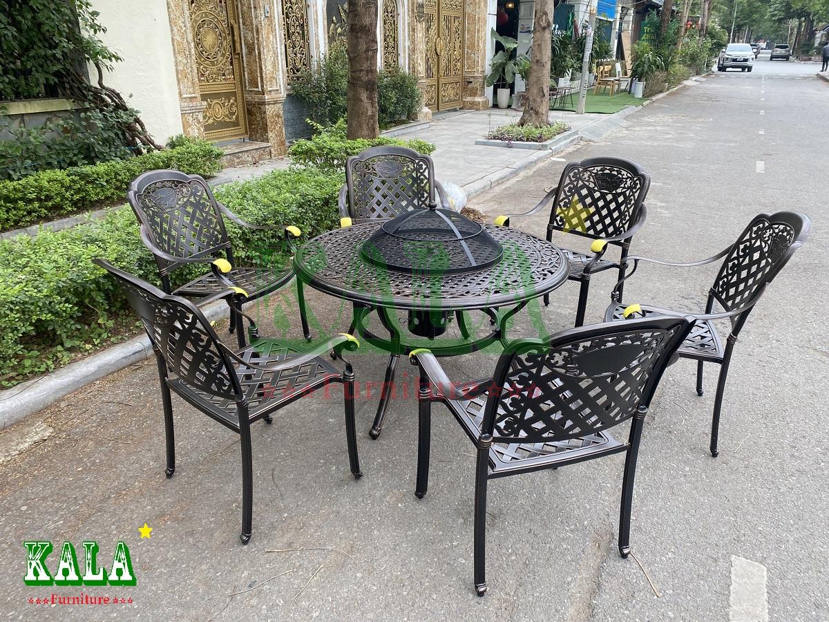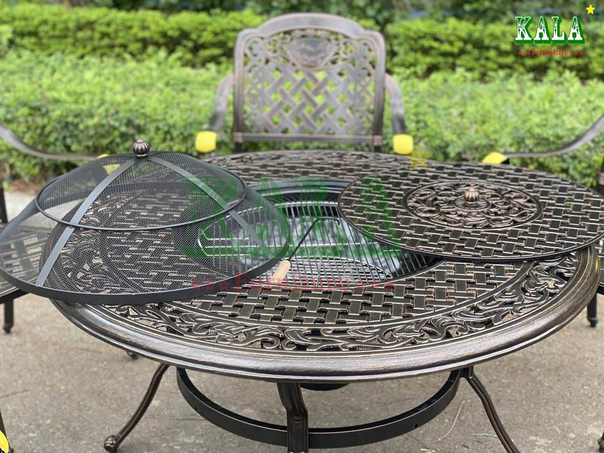 Bàn ghế nhôm đúc tích hợp bếp nướng BGND-BBQ120QT có thiết kế hoạ tiết quả trám từ ghế cho đến mặt bàn đơn giản mà vô cùng đẹp mắt. Bàn tròn rộng 1m2 nên dùng 6 ghế là phù hợp nhất.