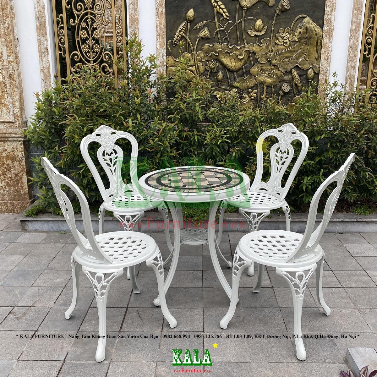 - Chất liệu: Nhôm đúc sơn tĩnh điện, mặt bàn đá nhập khẩu bo viền nhôm.