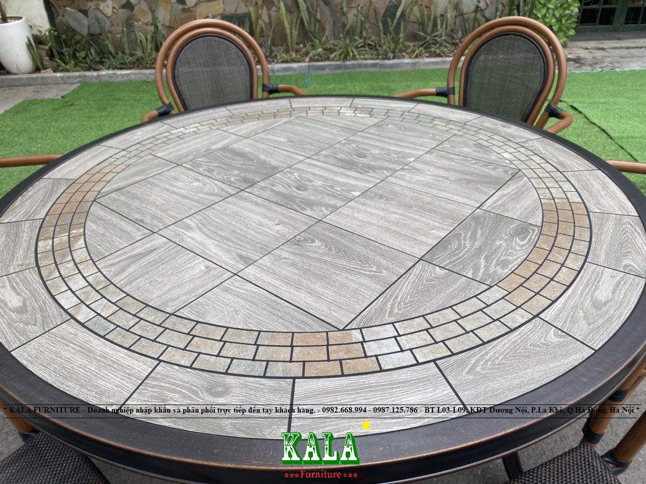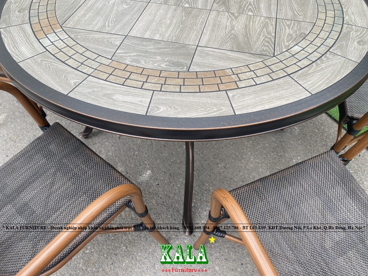 - Chất liệu: Khung nhôm đúc sơn tĩnh điện, mặt bàn đá có bo viền nhôm