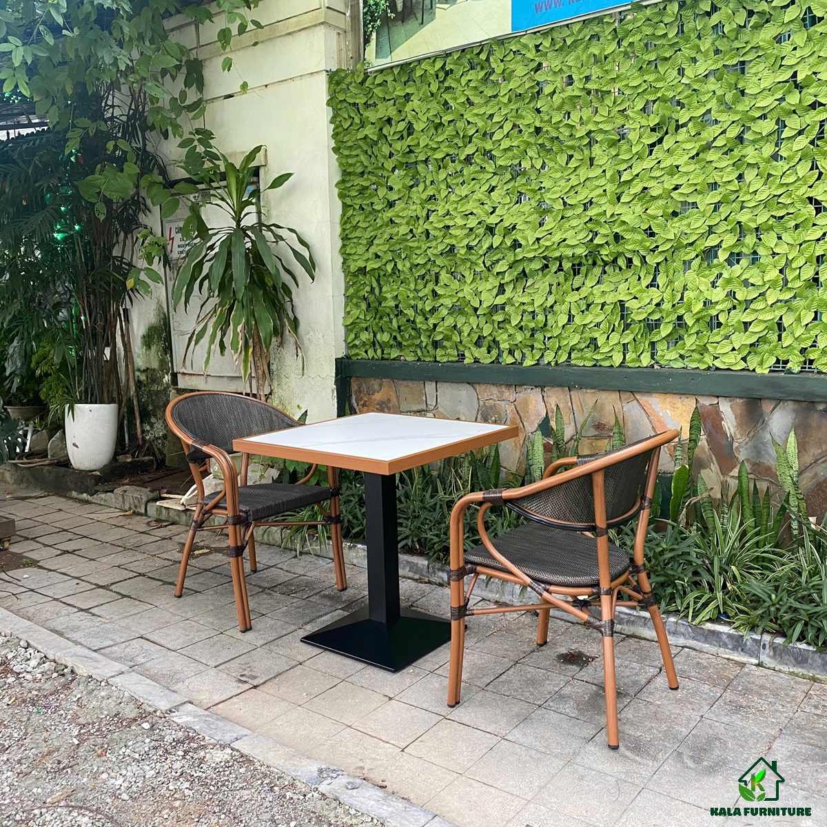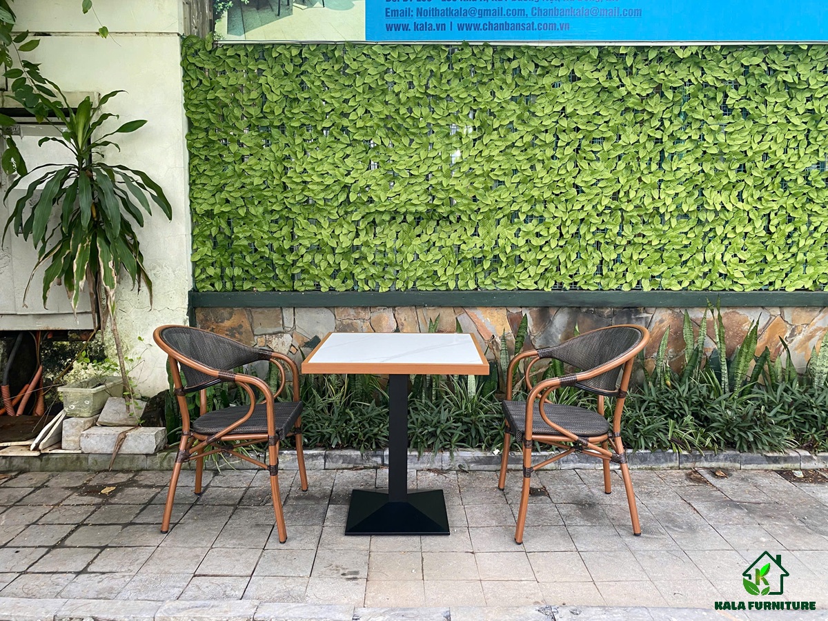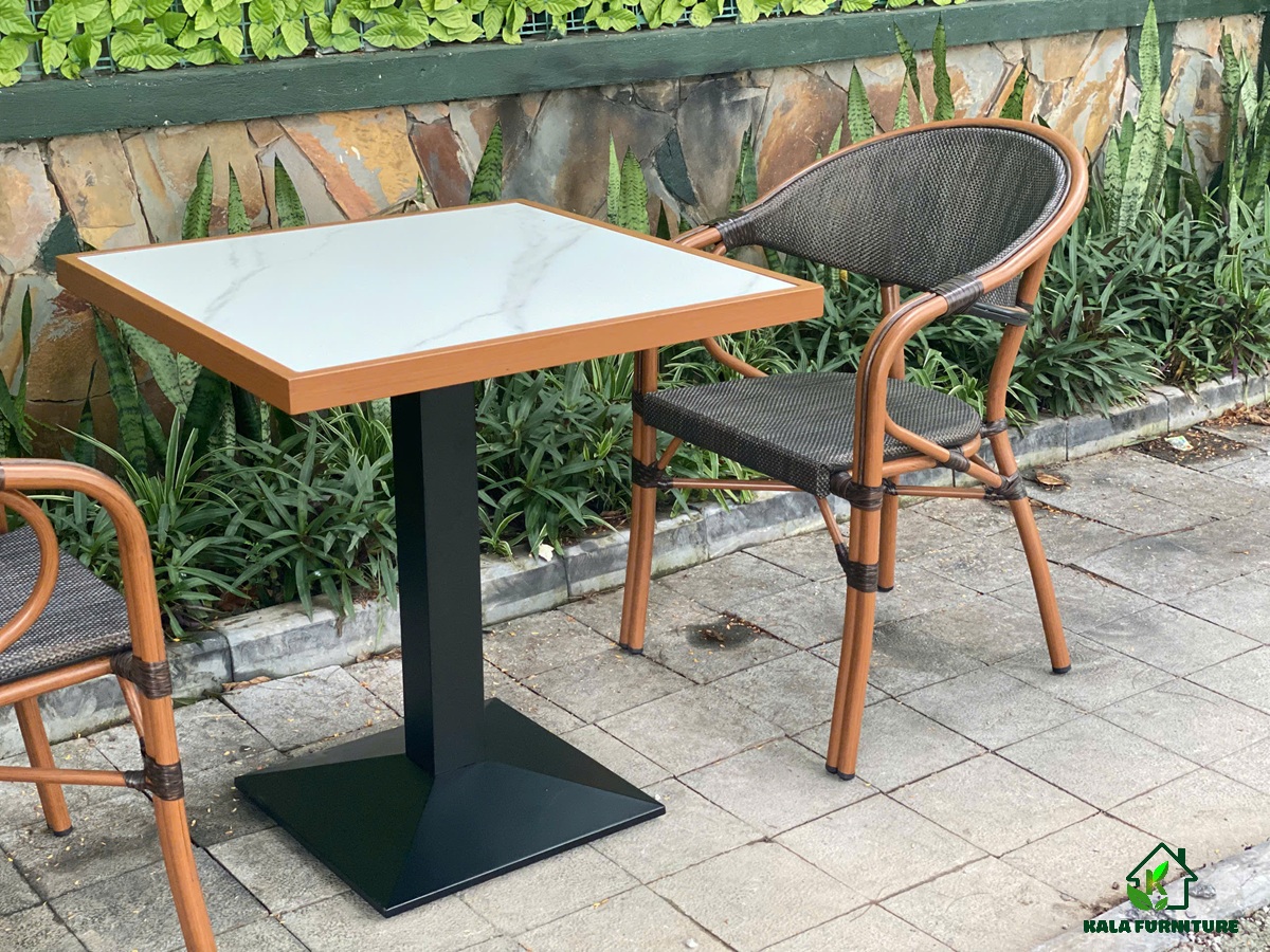 - Chất liệu: Chân bàn gang, mặt bàn đá bo viền nhôm giả gỗ sơn tĩnh điện.