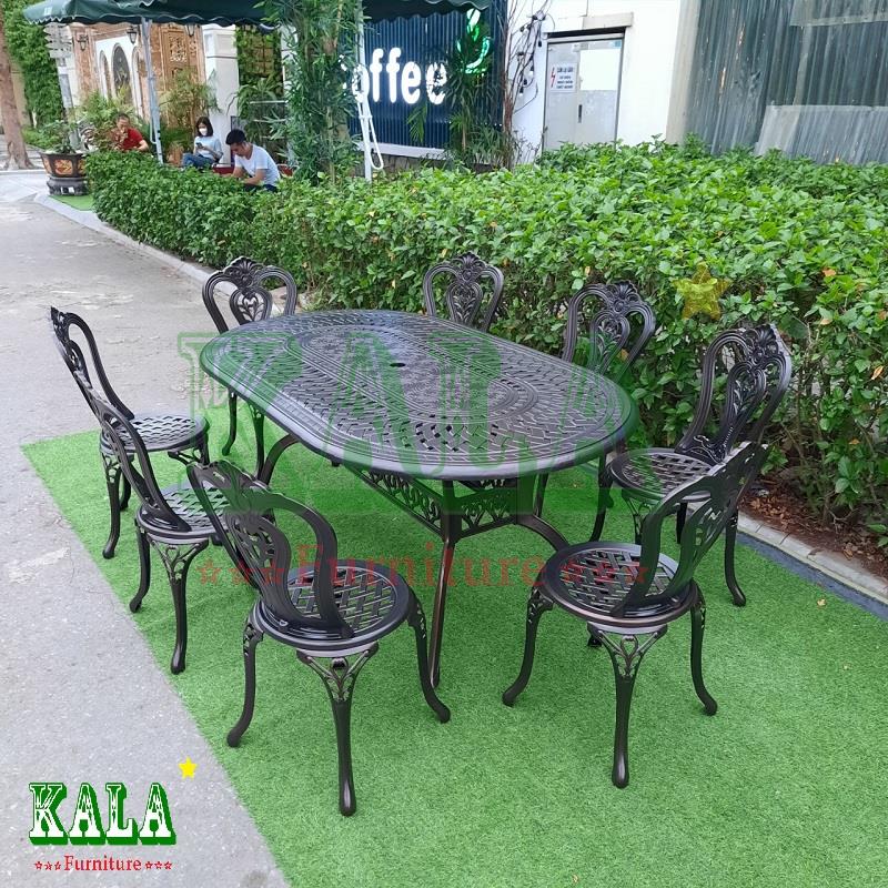 - Bàn ghế nhôm đúc có màu đồng đen kết hợp cùng các hoạ tiết hoa văn mang đến cho không gian của bạn sự cổ điển, sang trọng. Với khung nhôm đúc nên bàn ghế rất bền, khi ngồi có cảm giác chắc chắn, thoải mái.