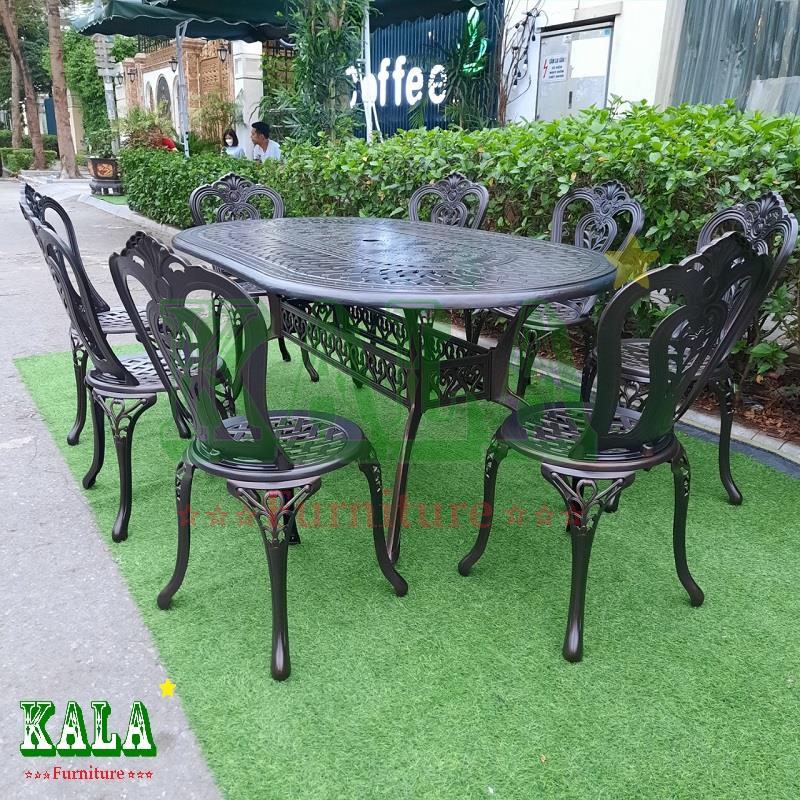Bộ bàn ghế nhôm đúc sân vườn BGND-OV10518TT có kích thước rộng, dùng cho 6-10 người dùng thoải mái, phù hợp với các khu resort, nghỉ dưỡng, gia đình đông thành viên hay có khoảng không gian sân vườn lớn.