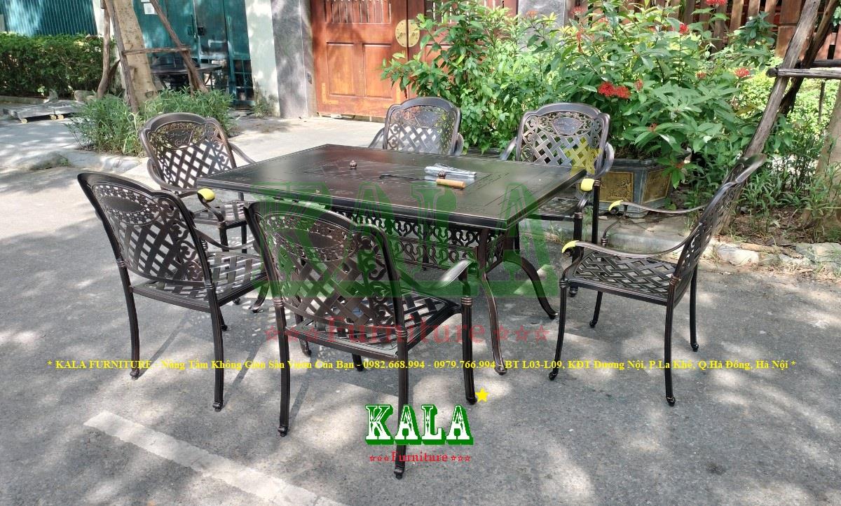 - Bộ bàn ghế được làm toàn bộ bằng nhôm đúc kết hợp với những hoạ tiết hoa văn đơn giản, vô cùng hiện đại và sang trọng. Bên ngoài bộ bàn ghế được phủ lớp sơn tĩnh điện màu đồng khá cổ điển và bảo vệ khung bàn ghế tốt hơn không bị gỉ sét, gãy hỏng khi dùng ngoài trời một thời gian.