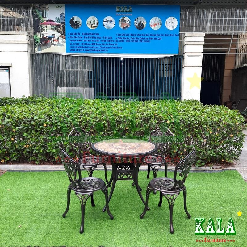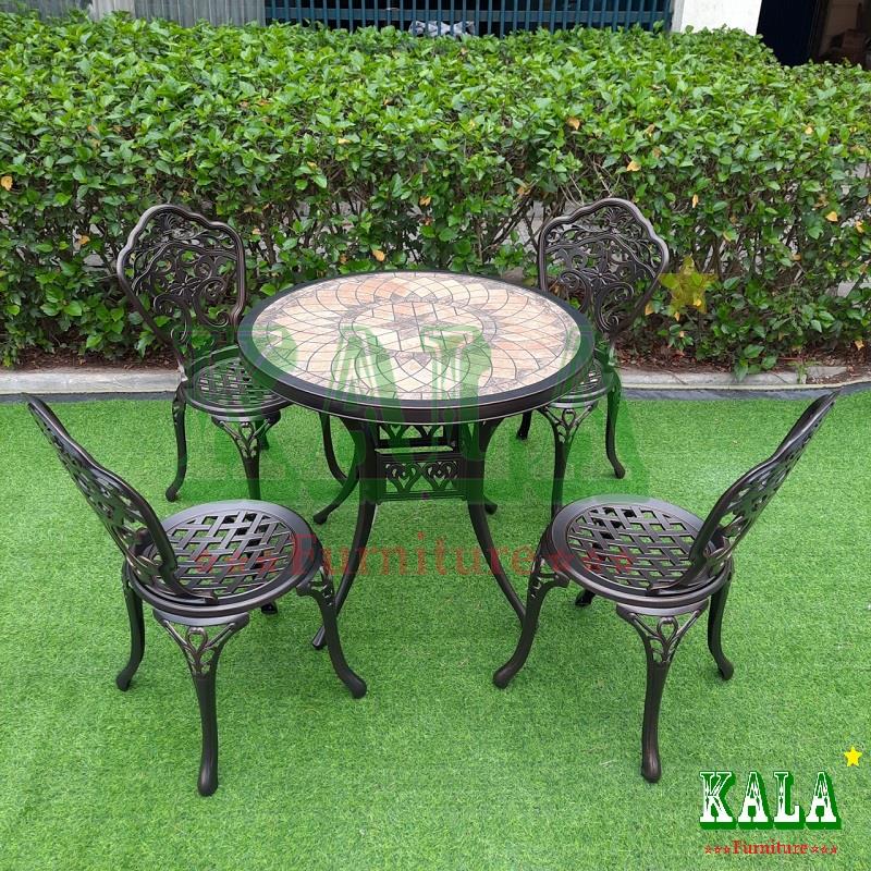 - Toàn bộ bàn ghế đều được làm bằng nhôm đúc, rất cứng cáp, chắc chắn. Riêng bàn thì có mặt được làm bằng đá hoạ tiết quả trám đơn giản, hiện đại mà lại còn bền. Mặt đá cũng được thiết kế bo viền nhôm vừa để bảo vệ bàn không bị sứt, gây mất thẩm mỹ vừa tăng tính thẩm mỹ, đồng bộ cho bàn ghế.
