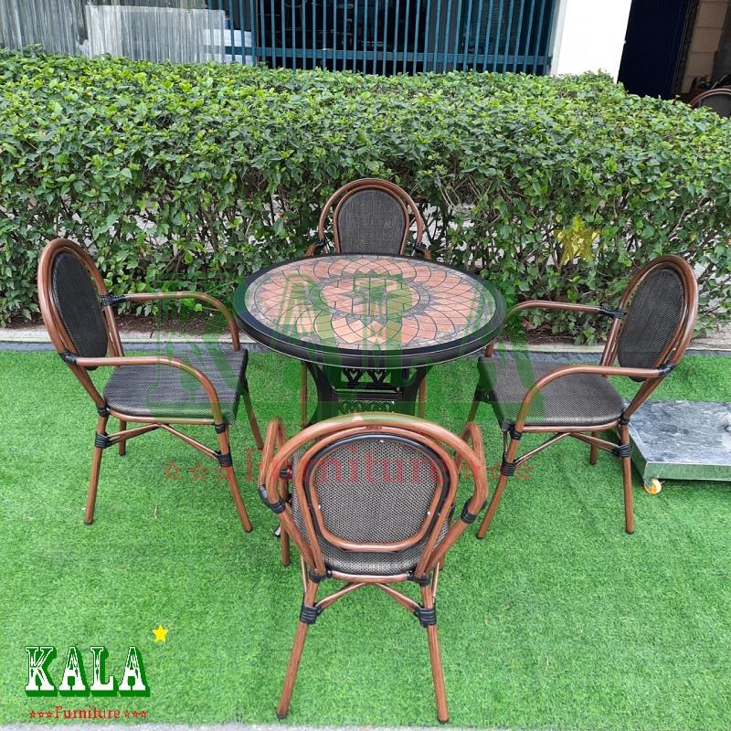 - Tổng thể bộ bàn ghế có mâu nâu, đồng (tông màu tối) mang lại sự ấm cúng, sang trọng. Bàn ghế được làm bằng chất liệu bằng khung nhôm nên có độ bền cao, phù hợp cho cả không gian ngoài trời, dưới cái kiểu thời tiết nắng ẩm, mưa nhiều của Việt Nam.