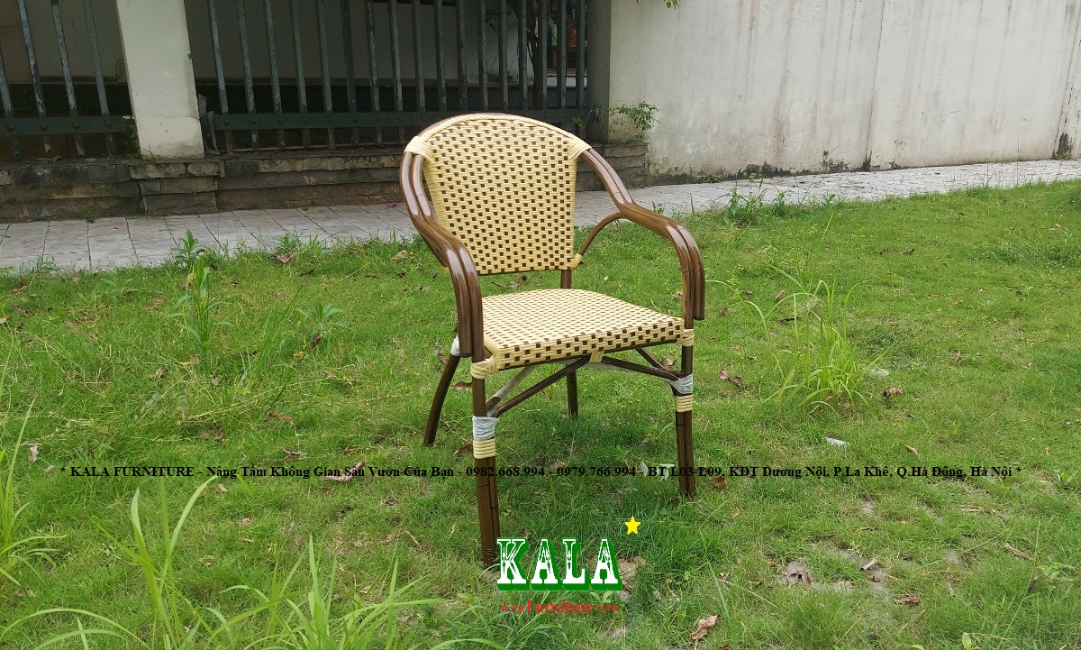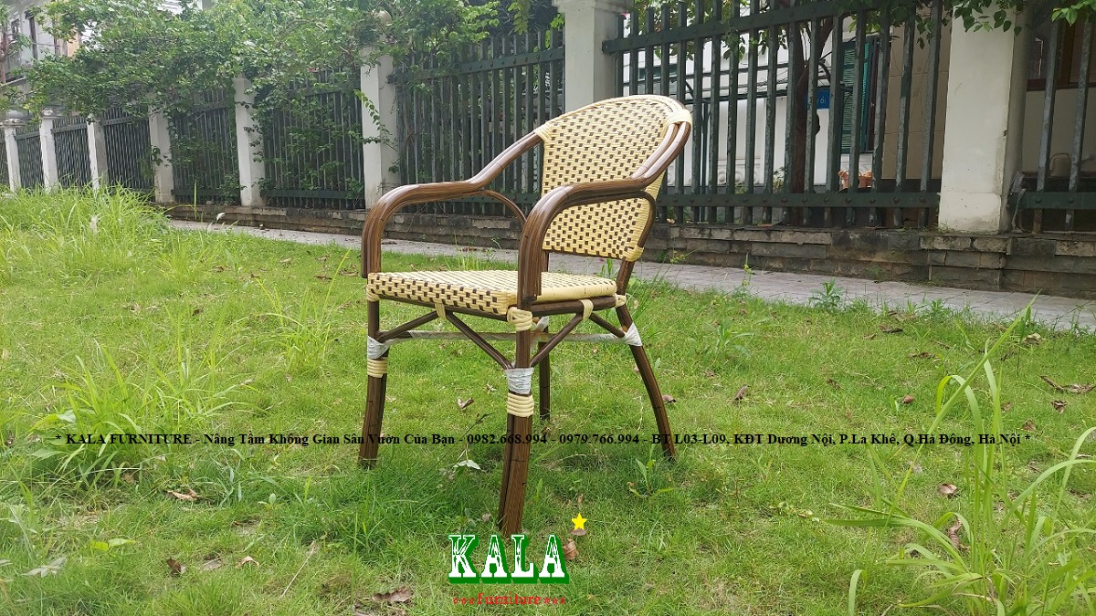 - Chất liệu: Khung ghế bằng nhôm sơn tĩnh điện, phần lưng và phần tựa bằng đan sợi nhựa giả mây.