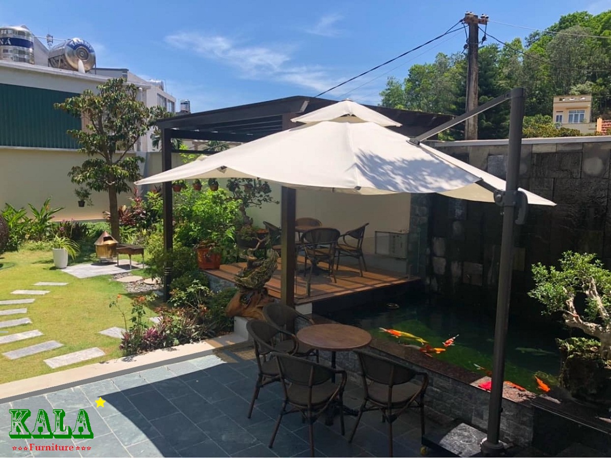 Ảnh 8: Mẫu ô dù lệch tâm khung hợp kịm nhôm tròn 3m được KALA cung cấp dùng cho quan cafe, kho ô kết hợp với những bộ bàn ghế cafe tuyệt đẹp mang đậm phong cách châu âu làm cho không gian của quý khách trở nên SANG TRỌNG - CUỐN HÚT hơn bao giờ hết.