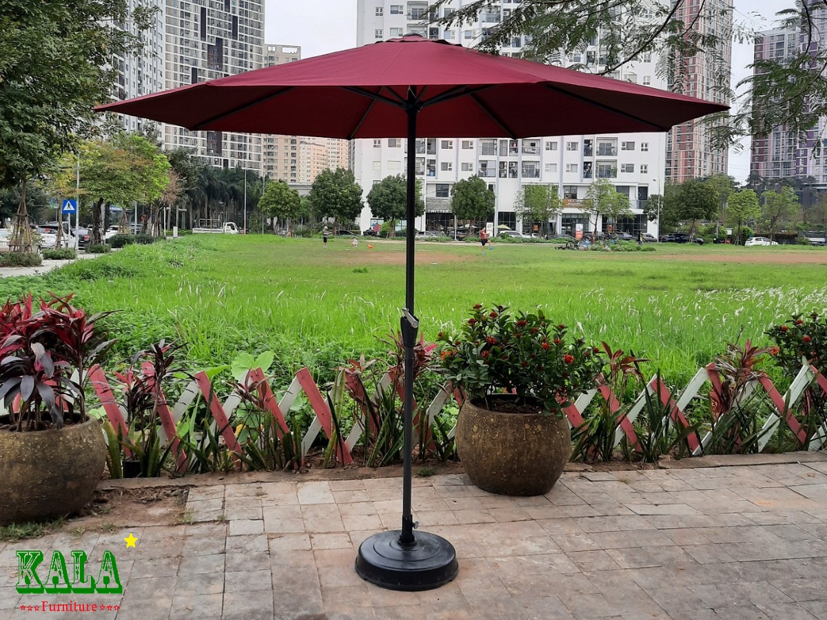 Ảnh 4: Ô dù chính tâm cán gỗ tròn 3m tích hợp chân đế bê tông bọc thép có bánh xe di chuyển rất tiện lợi, là mẫu ô được KALA bán chạy nhất hiện nay bởi sự mộc mạc được làm bằng gỗ tự nhiên một phong cách giản dị mà không kém phần sang trọng.