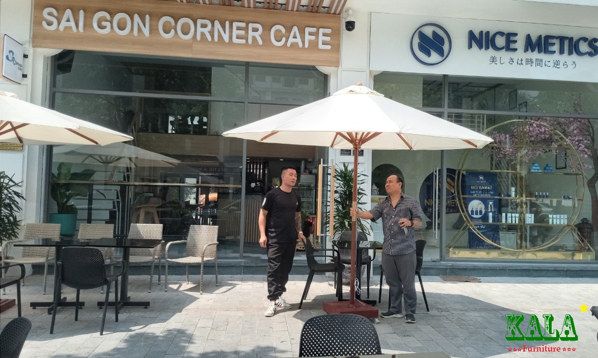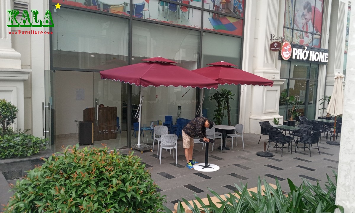 Ảnh 5: Mẫu ô dù chính tâm cán sắt tròn 3m được KALA bàn giao tới khách hàng tại Long Biên, Hà Nội. Với những quán ngoài trời thì Ô dù là một sản phẩm không thể thiếu vì chúng có nhiều công năng như che mát cho khách hàng mỗi khi ngồi thưởng thức thư giãn và cũng là bảo quản được những bộ bàn ghế sử dụng được bền đẹp hơn cũng như tạo một không gian quán đẹp hơn, thu hút hơn.