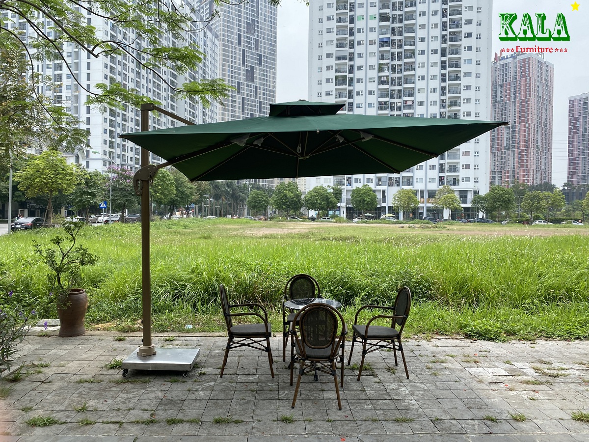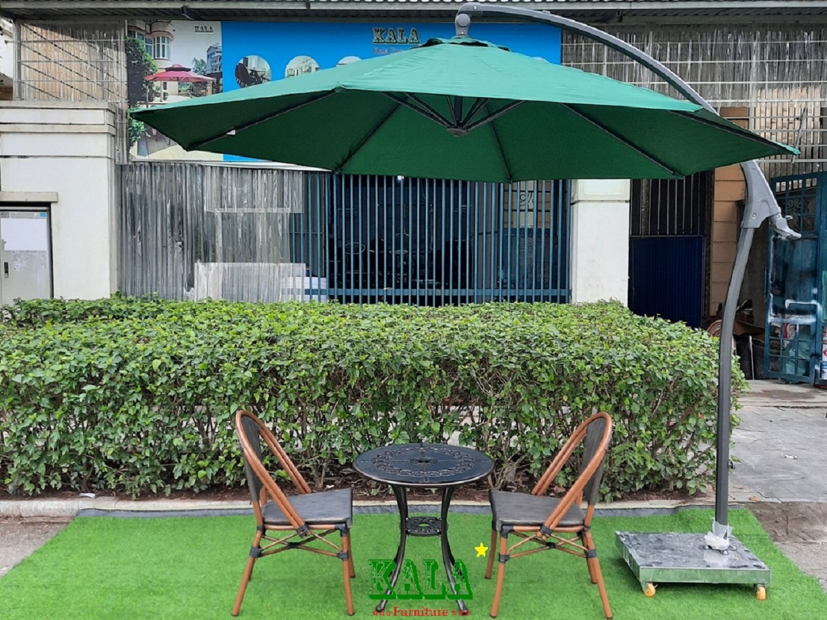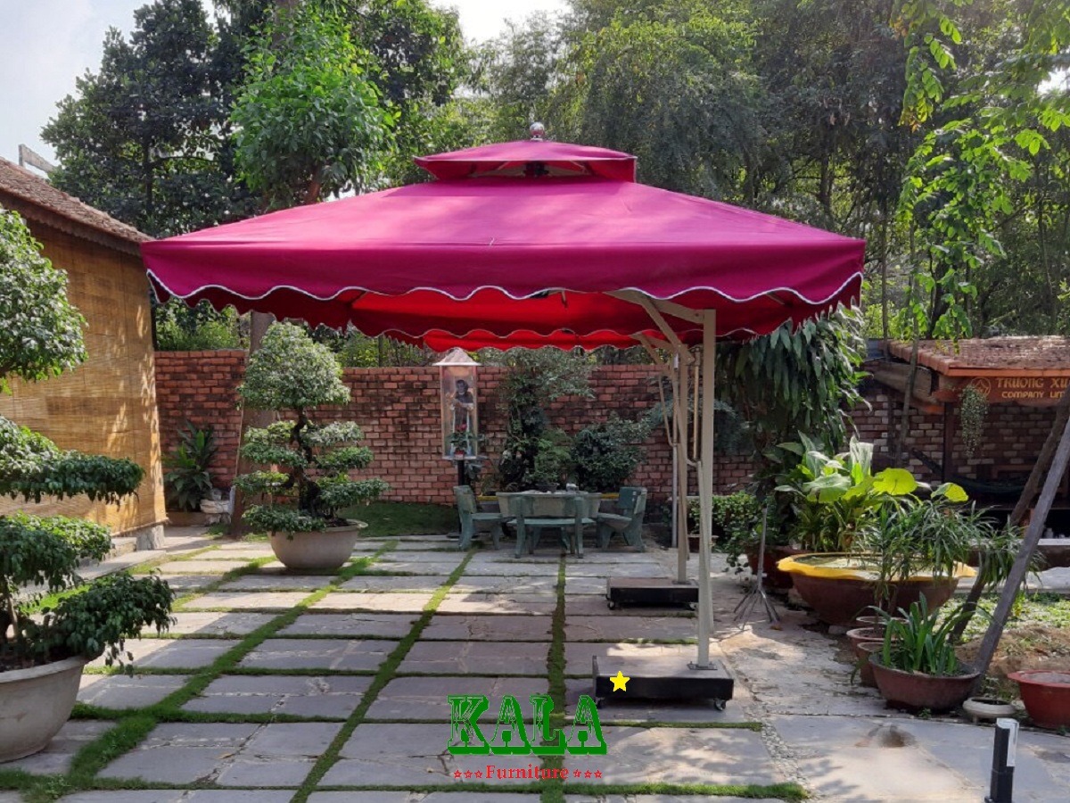 Ảnh 9: Ô dù lệch tâm khung thép cao cấp với rất nhiều ưu điểm Bền đẹp - chắc chắn, căng lên - thu gọn lại rất đơn giản dễ dàng, với khung được làm bằng nhôm sơn tĩnh điện bền đẹp kết hợp với áo ô được làm bằng vải POLYESTER dùng ngoài trời chịu nắng mưa rất tốt. đế ô được làm bằng bê tông bọc inox bên ngoài chân có hàn thêm bánh xe giúp di chuyển dễ hàng.